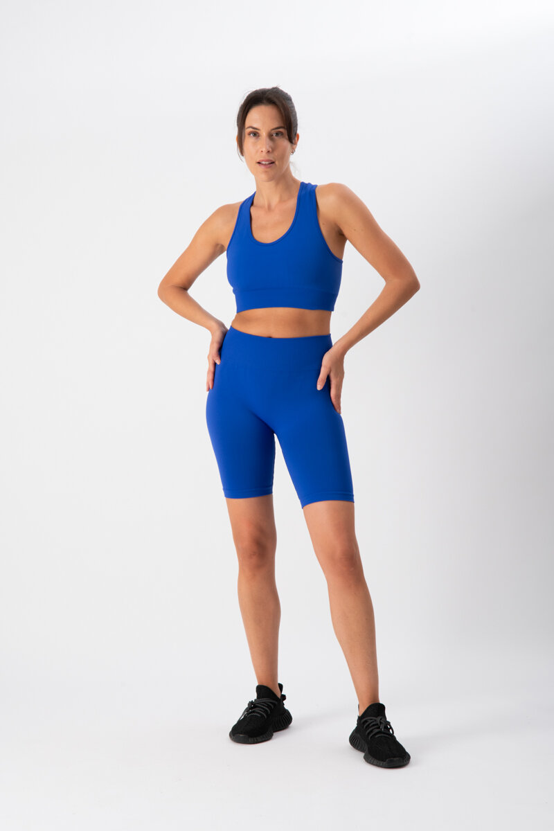 Completo composto da top sportivo Kaia con design a T sulla schiena e shorts biker coordinati