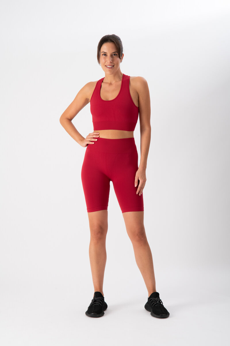 Completo composto da top sportivo Kaia con design a T sulla schiena e shorts biker coordinati