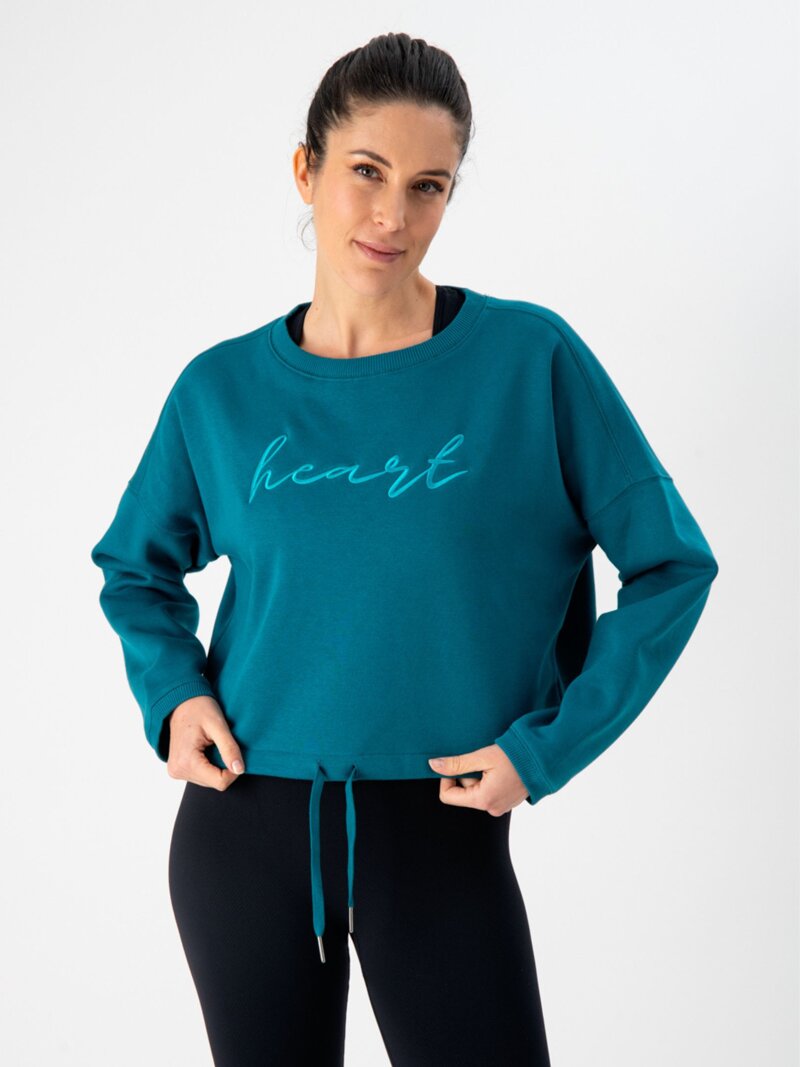 Felpa girocollo corta in colore Teal con ricamo tono su tono, dallo stile essenziale e moderno