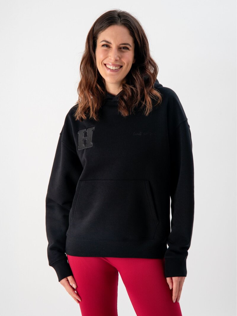 Felpa con cappuccio in colore Black, elegante e versatile, con ricami tono su tono per uno stile minimal e premium