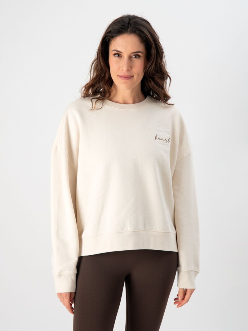 Felpa girocollo in colore Candle Cream con ricamo HEART tono su tono e a contrasto, essenziale e luminosa