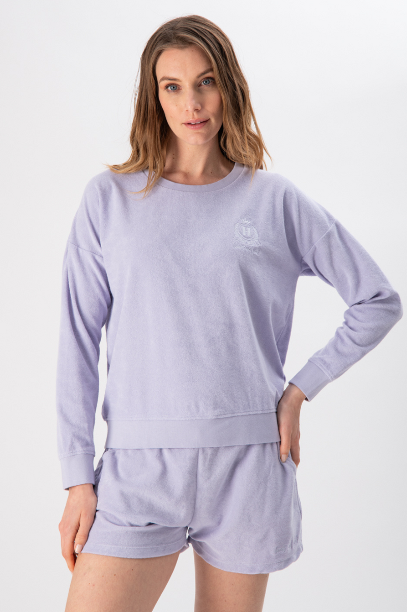 Il tessuto in spugna è morbido, traspirante e naturale sulla pelle. Avvolge il corpo con una sensazione di comfort continuo, mantenendo leggerezza e libertà nei movimenti.