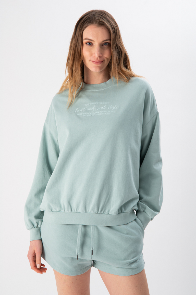 Realizzata in cotone biologico, questa felpa unisce comfort naturale e stile contemporaneo. Il fit oversize con spalle scese e le maniche a sbuffo creano una linea morbida e distintiva, facile da indossare con leggings o denim per un look casual e rilassato.