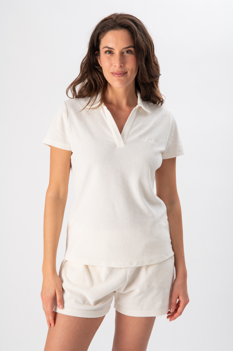 Il tessuto in spugna è morbido, traspirante e naturale sulla pelle. Offre comfort e leggerezza, mantenendo una sensazione ordinata e rilassata durante tutta la giornata.